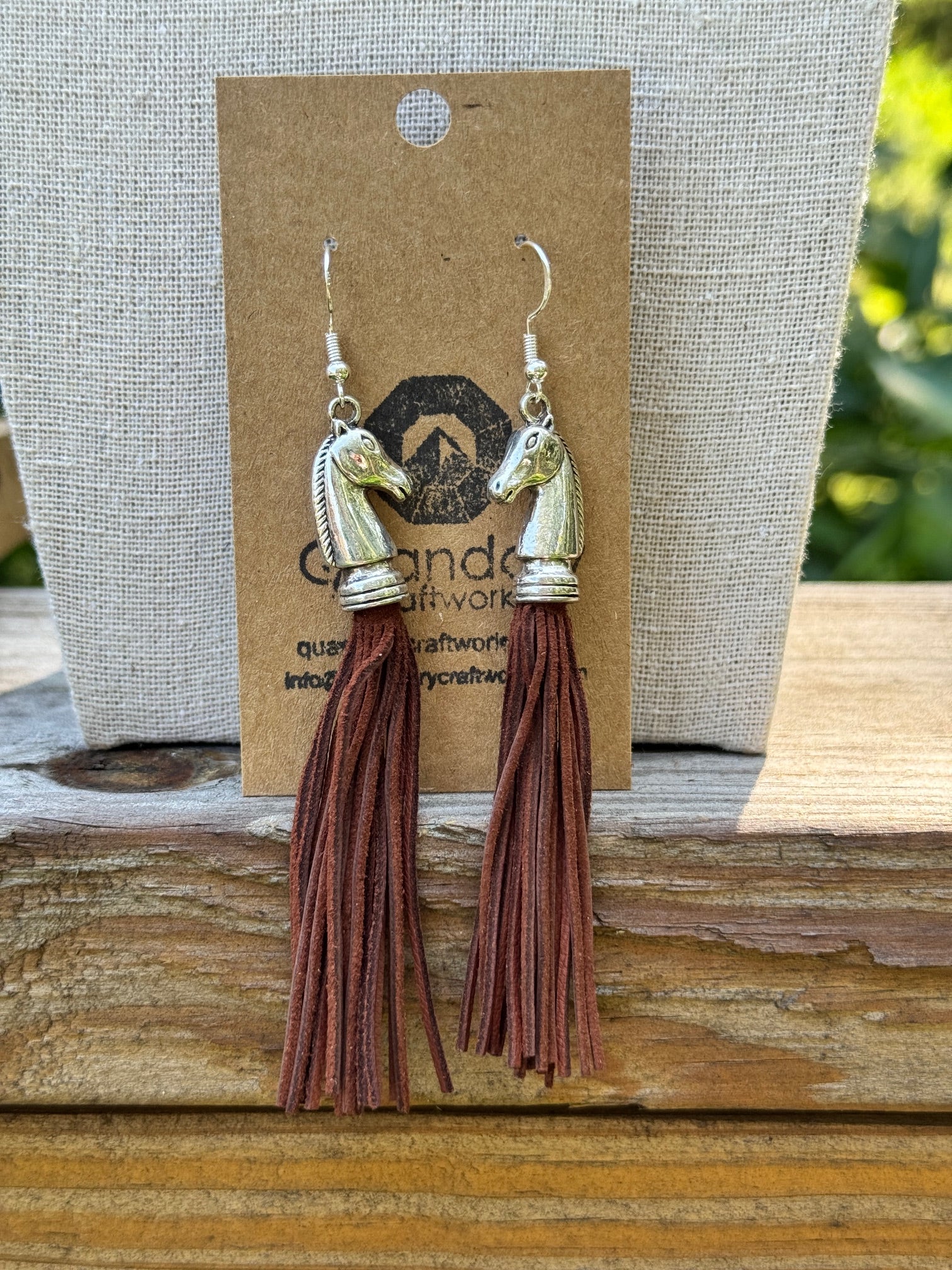 Elegant earrings adorned with horsehead motifs and tassels, crafted for admirers of equestrian and rodeo traditions. Three variations of leather tassel color available.